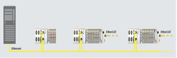 在基本配置中,有两个与集成式交换机相连的 RJ 45 插口可以用作接口。这样就简化了在一个线型拓扑结构内对多个CX9000/CX9010进行网络布线的工作,而无需使用单独的交换机硬件。两个可从外部访问的以太网端口独立于 EtherCAT 接口,它通过由 CPU 提供的第二个 MAC(介质访问控制器)进行操作。